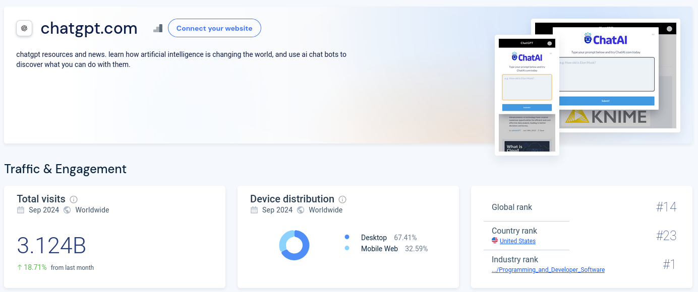 ChatGPT.com now up to 3B visitors per month. #14 global rank incredible, where will it end up? +18% MoM. Google.com is the global #1 with 81B visitors, #2 Youtube.com with 21.5B, #3 Facebook.com with 5.6B. At the rate ChatGPT.com could surpass Facebook.com before Q2 2025.