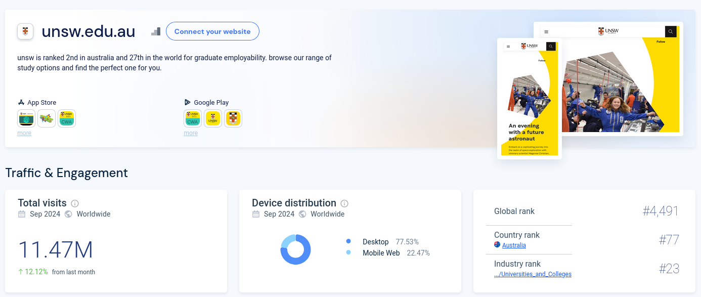 Australian universities receive more traffic than I would expect. UNSW ranked #77 in Australia. According to Wikipedia UNSW have 12k staff and 66k students. 11.4 million visits is 146 visit per month per student/staff.